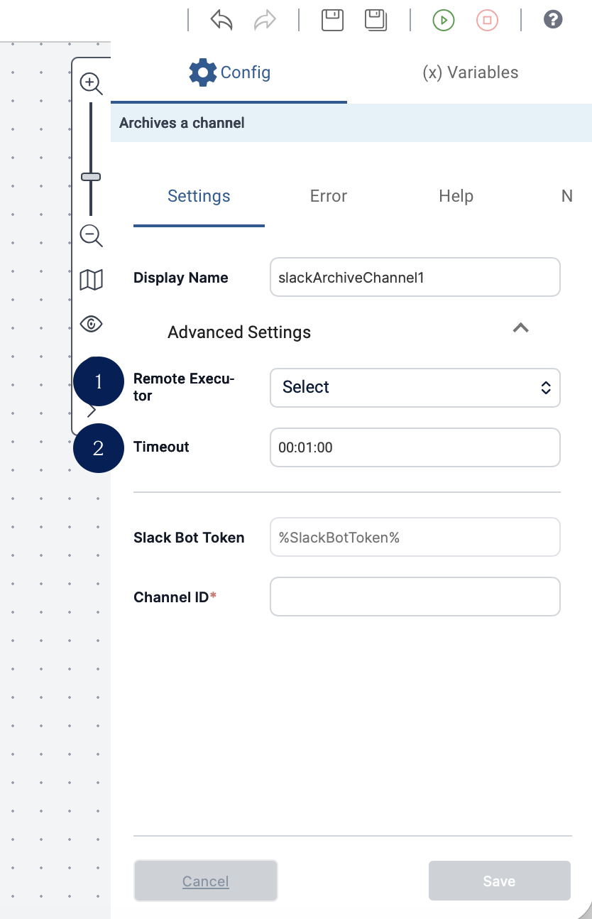 The Details dialog will open on the right side of the canvas and allows you to view and modify key activity parameters, such as implementation settings, timeouts, and error handling. The interface elements are: